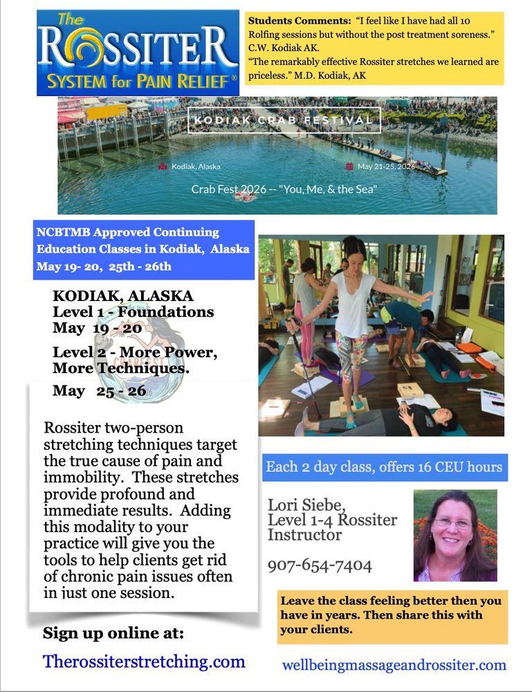 Upcoming classes in April and May. Relaxation Massage and Rossiter available in Kod