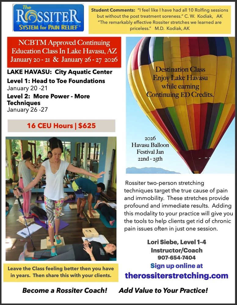 If you are interested in setting up a class in your area please contact me. The Rossiter Stretching technique is an incredible technique to incorporate into your practice or begin a new career as a Rossiter Coach. Go to therossitersystem.com for more information about classes currently being offered and what each class entails.